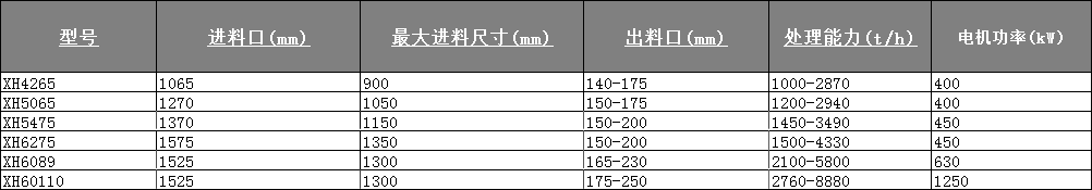 XH 旋回式破碎機(jī)擁有精細(xì)的破碎腔設(shè)計(jì),確 保更強(qiáng)的生產(chǎn)能力、更大的進(jìn)料粒度及更長(zhǎng)的襯板 壽命;大傾角和長(zhǎng)破碎面設(shè)計(jì),配合優(yōu)化設(shè)計(jì)的沖 程和轉(zhuǎn)速,使破碎機(jī)具有超強(qiáng)的破碎能力,適用于 各種粗碎破碎作業(yè)需求;通過(guò)簡(jiǎn)單更換偏心套,就 可以改變破碎機(jī)的處理能力,以滿(mǎn)足不同的破碎工 藝需求。